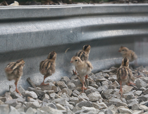 Posted: June 15, 2008 Filed under: All's Well That Ends Well 1 CommentThe other day, the Romgi and I came home from work and were just about the head down the steps to our new apartment when we noticed that there was a very, very fat female quail sitting at the bottom of the stairs, on the little porch outside our door. She looked really strange – and she kept squawking at us. The Romgi took a step forward; she suddenly flew up to the roof, leaving behind about a dozen tiny baby quail!