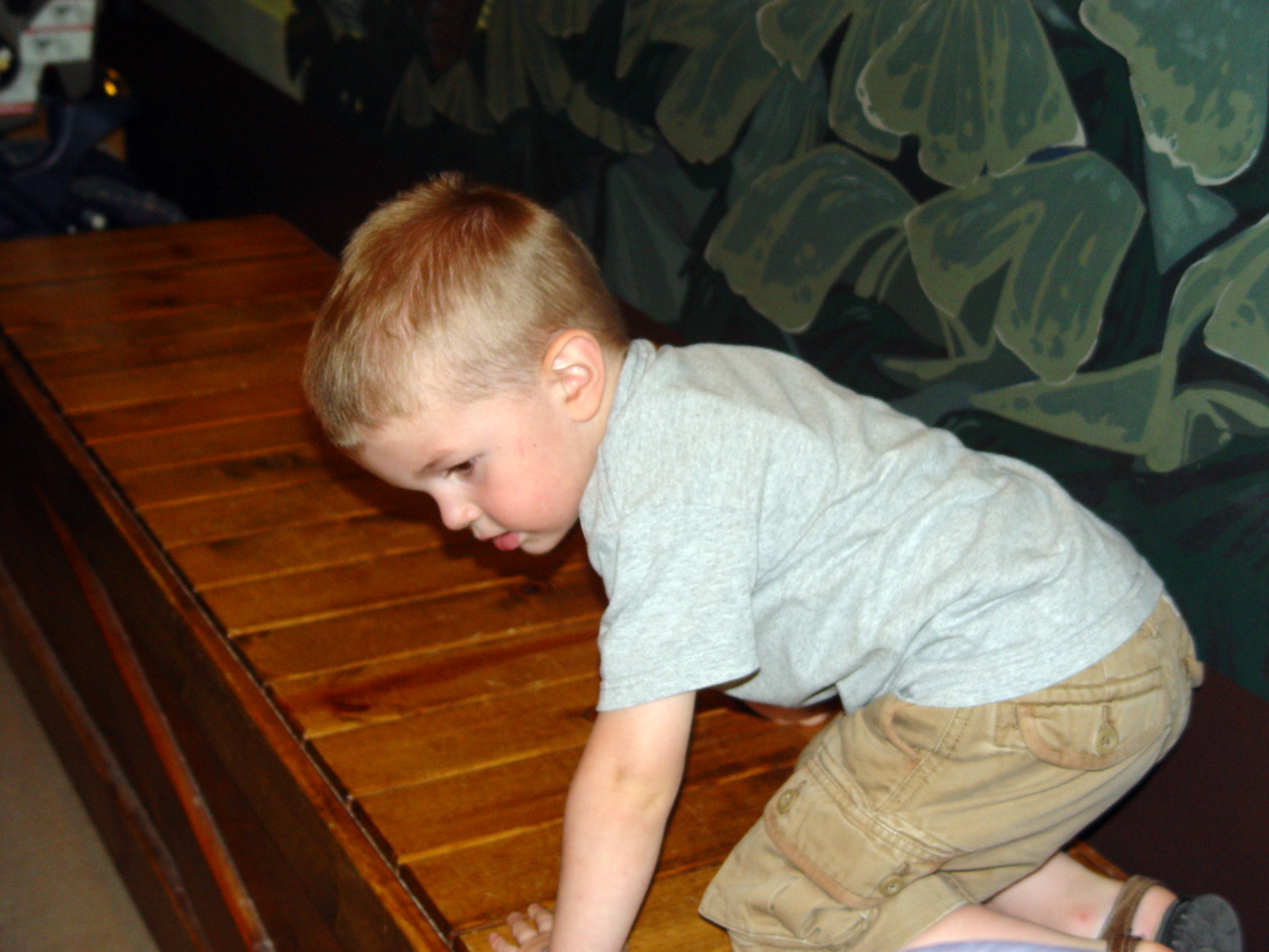 This room, which smells heavily of chlorine, has a big wrap-around table filled with water and sand. Kids can build dams and create rivers and streams, complete with plastic dinosaurs and palm trees. I suppose on a slower day they could watch as the water washed away their dams and moved the dinosaurs and trees around, but it was packed when we went. See that crowd? Bleh.