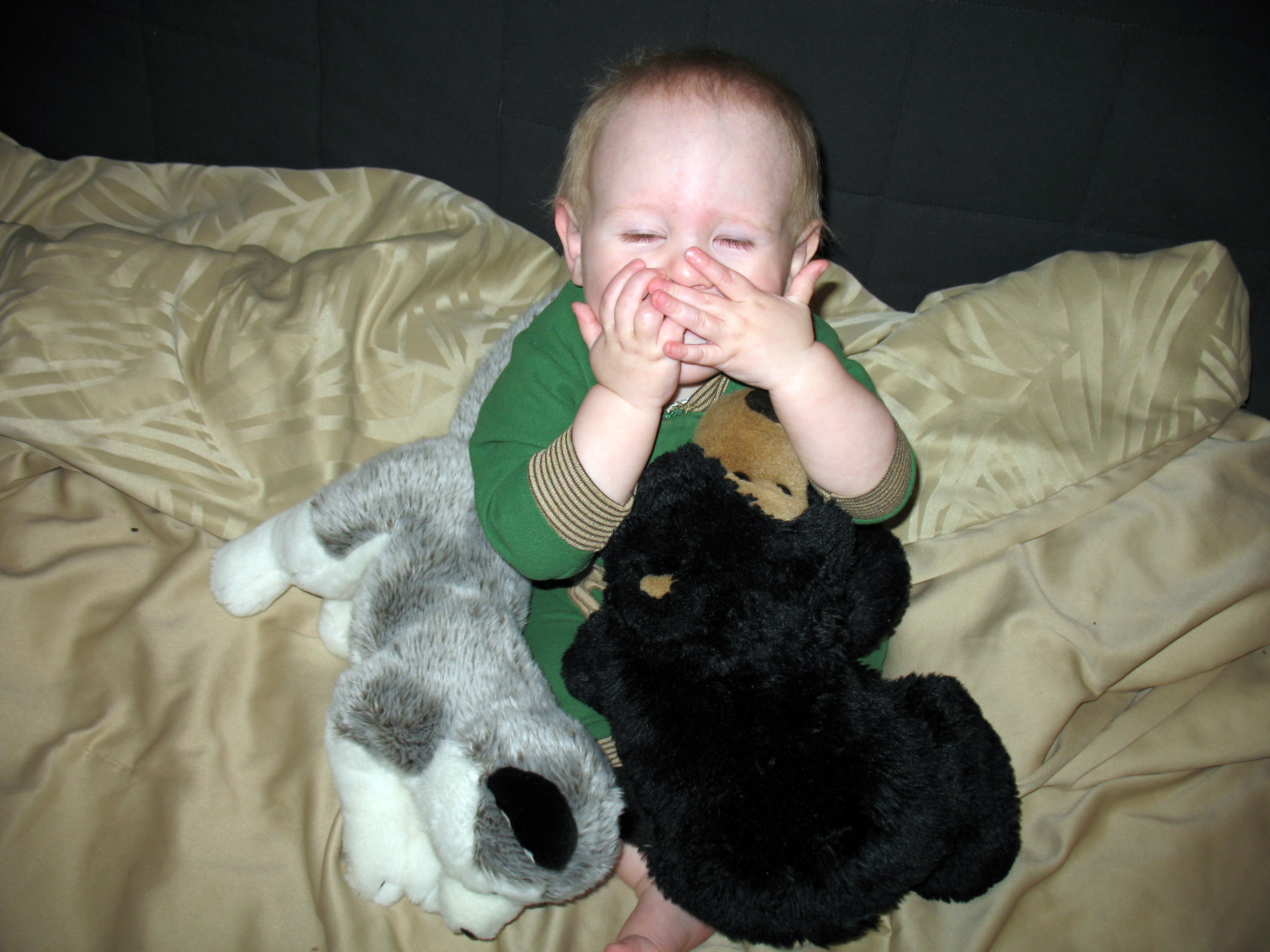 That night he refused to go to sleep, and constantly cried out for “Dog! Dog!” I really wanted him to just go to sleep, so in desperation I got out an old stuffed black bear I had and gave it to him, telling him it was a dog. Worked like a charm. He calmed down and was soon asleep. I put the Bwun in his crib and the bear on the dresser.