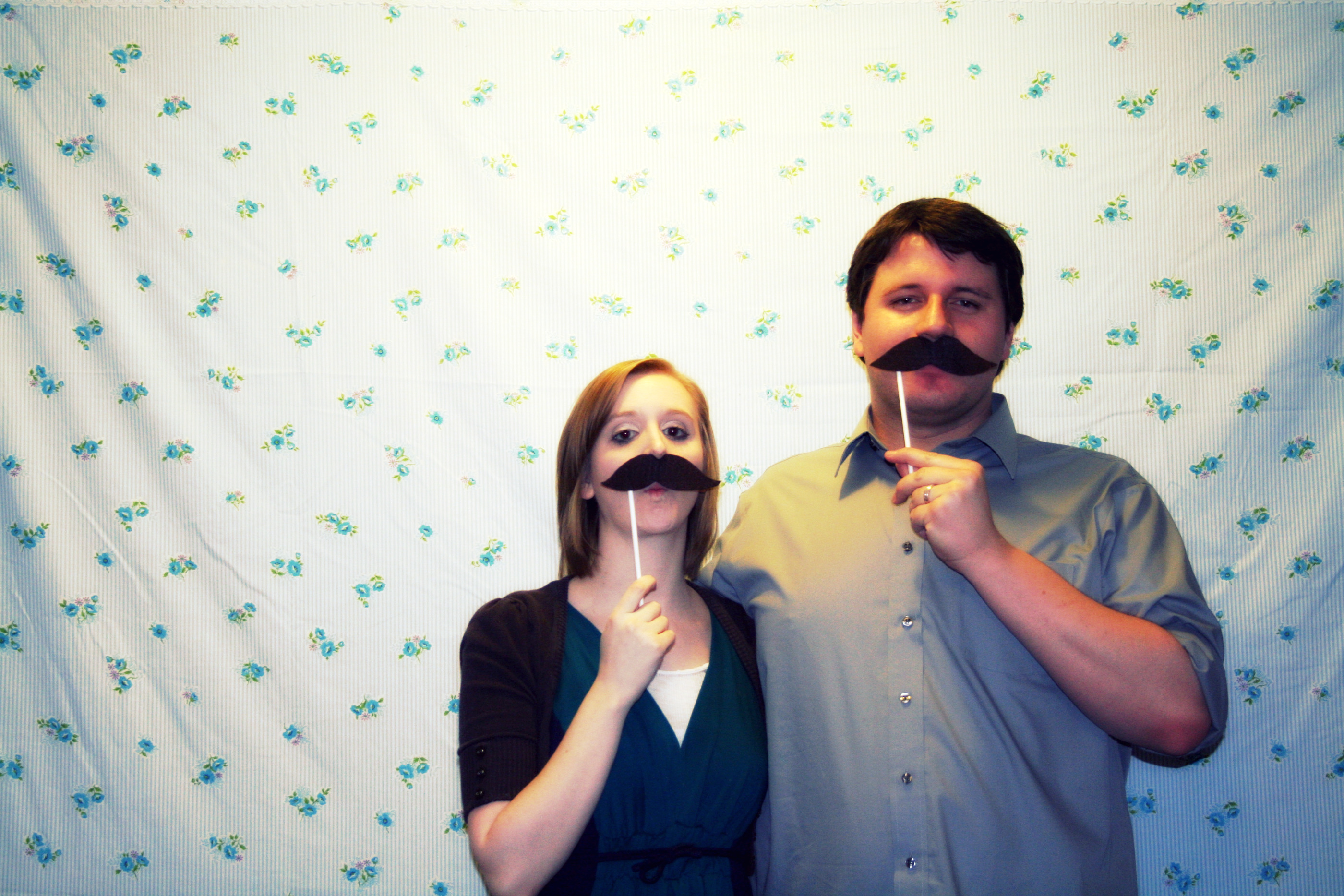 The night before, I set up this thrift store sheet as a photo backdrop so we could all have our picture taken. With our mustaches.
