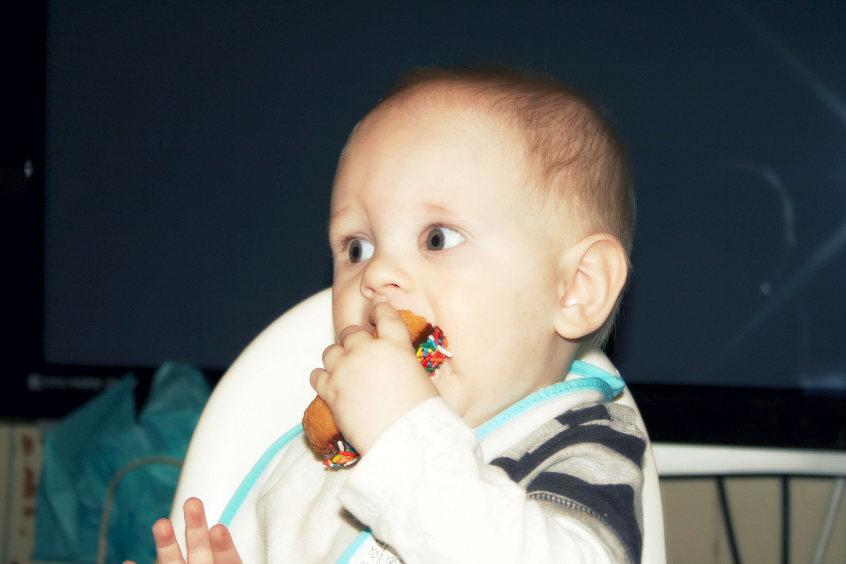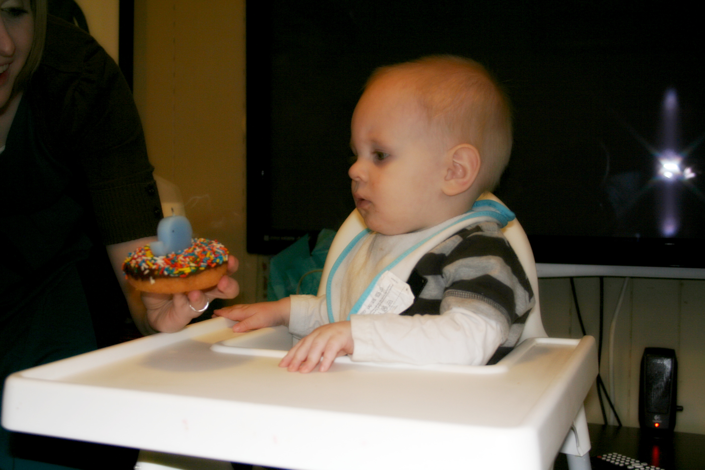 Remember that Williams-Sonoma giant donut cake pan I love? I made a miniature one for the Bwun! ...Ok, fine, we got a donut from the BYU Creamery. It seemed fitting. The candle is a blue elephant.