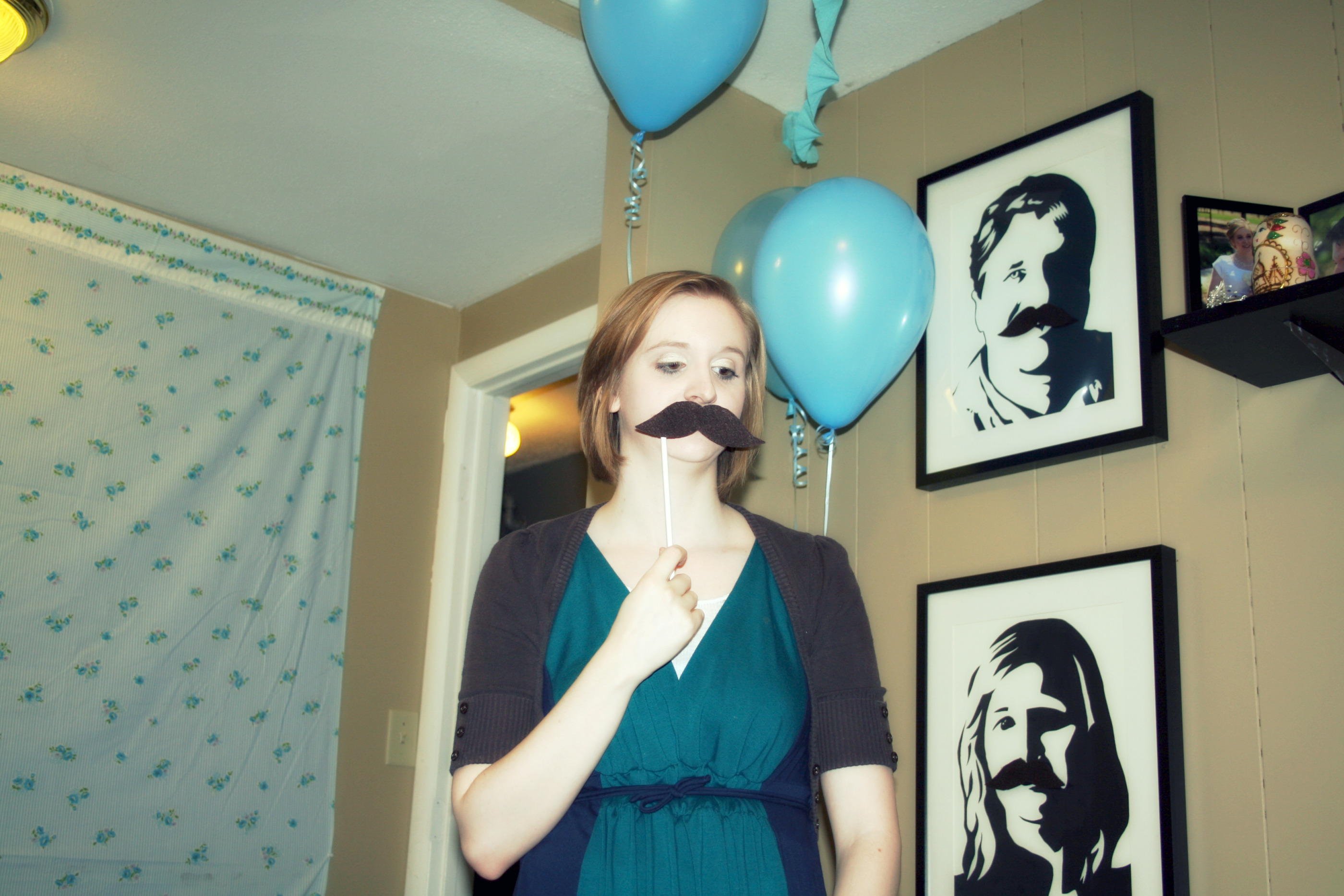 I had a little vase filled with mustaches for guests to use. The mustaches were made from dark brown felt, cardstock, and something from the craft store called "cookie sticks."