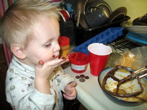 After we finished mixing the batter, the Bwun wanted to try some. Being responsible parents, we let him.
