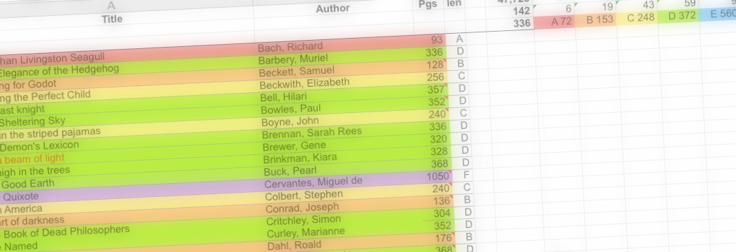 Does this give you some insight into how my mind works? I really adore spreadsheets. This one has formulas to calculate the average book length per year and an entire sheet devoted to tracking what percentage of all the books I’ve read were read in a given year. The first sheet is my to-read list. If you’re confused, please just go look at it. It might make sense. Or it might not.