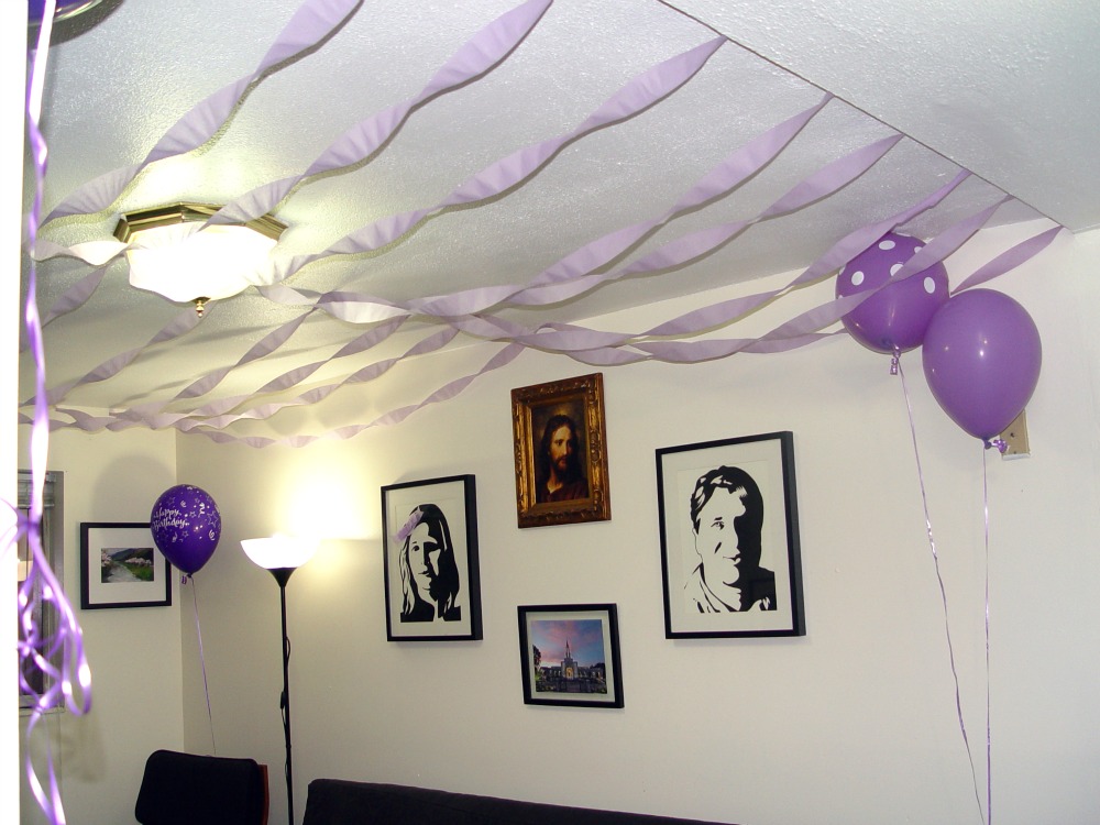 Since I feel indifferent (at best) about my birthday, I decided to try a casual join-us-for-cake gathering with a few friends. I’m not a huge fan of being the center of attention during a more formal present-opening party, so a smaller group seemed ideal. And I always love an excuse to make that delicious chocolate pumpkin cake. This time, we went for a pinkish lavender frosting instead of orange; I got these tall candles (not at all the color in the picture, by the way) and decorated the house with lavender streamers and balloons, which the Romgi kindly provided. (jr even matched the polka dot balloons. It was adorable.) Take a look: