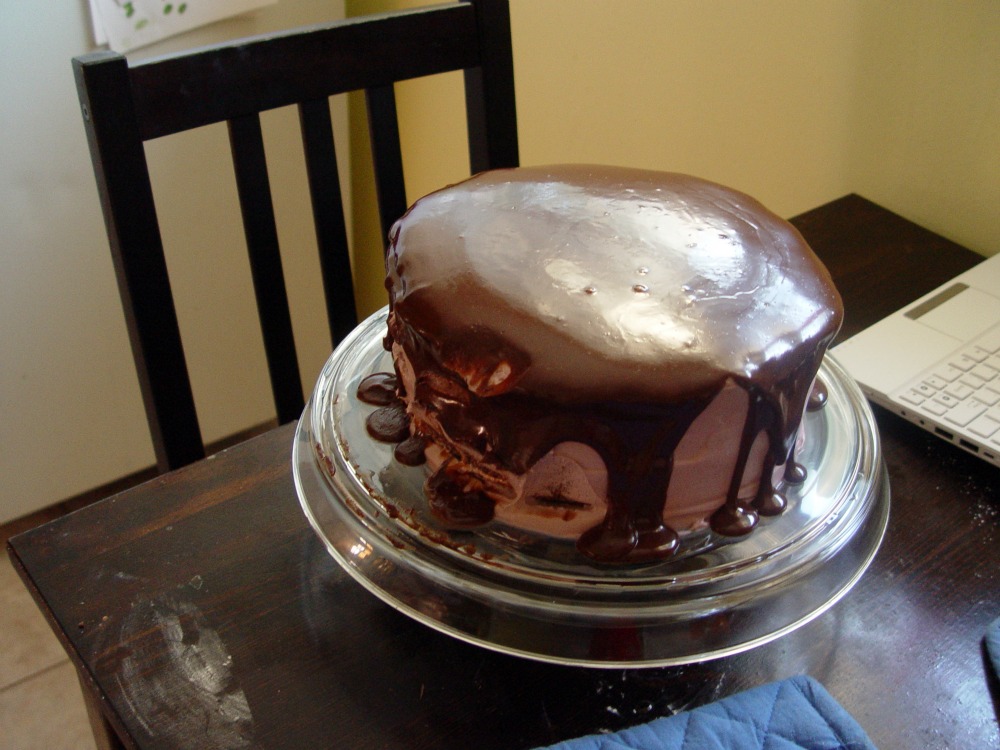 Now, about the cake. It has two layers that have to cool completely before the frosting goes on, and while that could easily be done if you had a real oven, I had to make the layers separately the night before. (I planned to leave plenty of time during the day for cleaning, but instead I cleaned all night.) The Romgi took care of the frosting and ganache; while he went to grab some dinner before dessert, I let the Bwun sit in the middle of the kitchen with the chocolate-covered spatula. Then, for whatever reason – let’s say lack of sleep leading to lack of good judgment – I went to take a picture of the balloons and streamers. When I came back into the kitchen, this is what I saw: