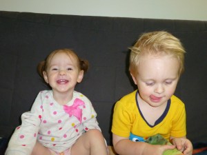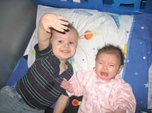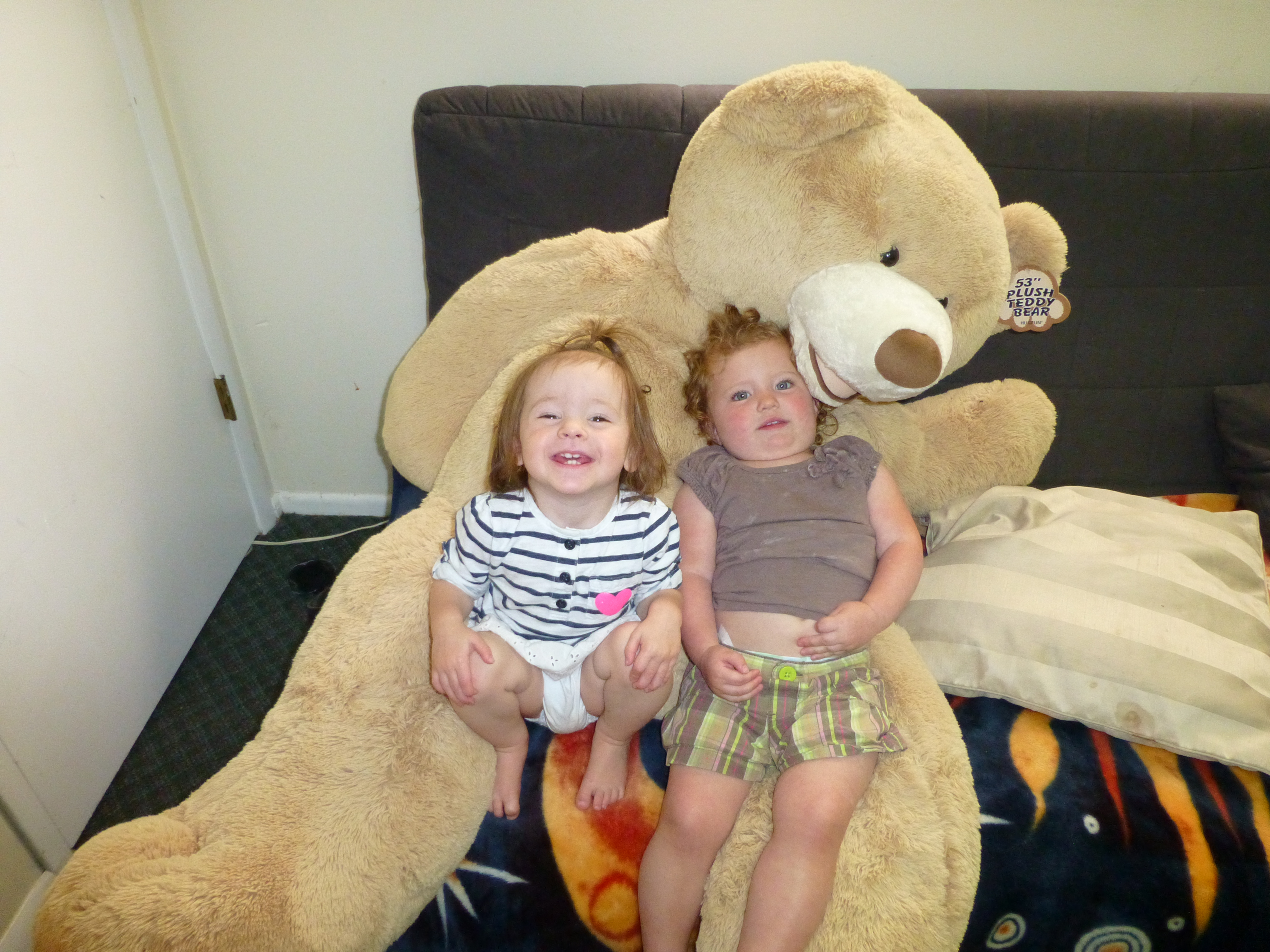 She had a friend come over. June is a month OLDER than this other girl but…well…quite a bit smaller! We got the giant bear as a reward for Evan, who was having trouble remembering not to put things in June’s crib at bedtime. When he reached a certain number of days without incident, we got the bear, which is fortunately too big for him to pick up and put in her crib.