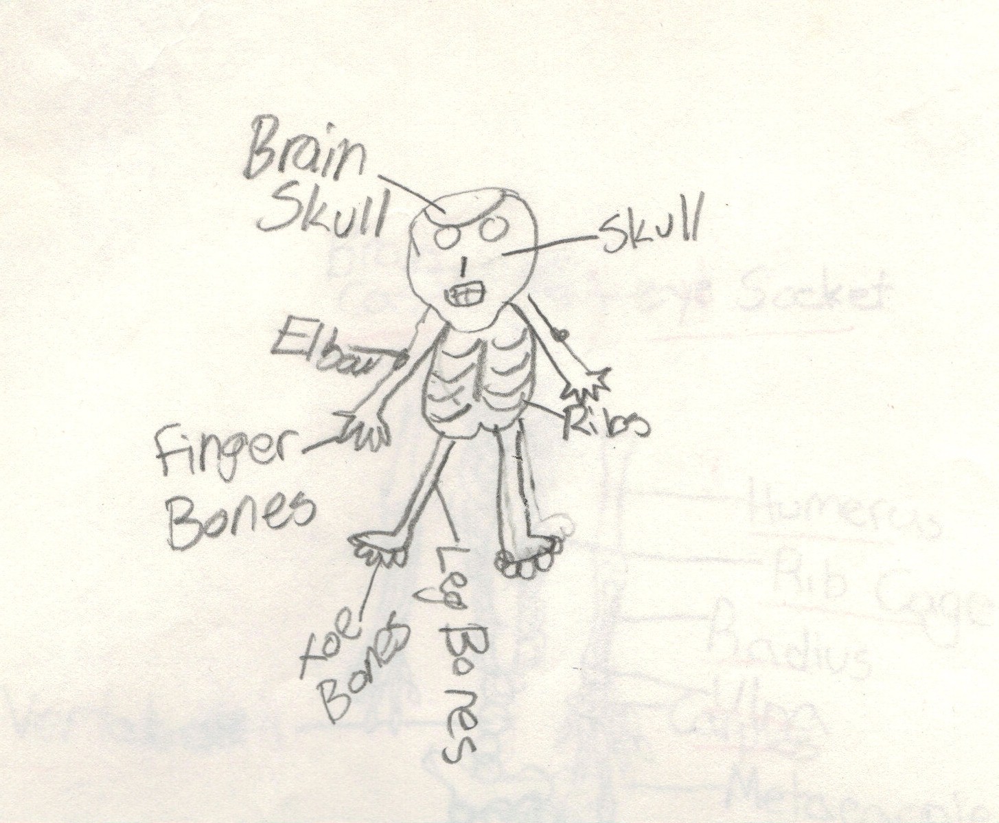 In third grade, we did a unit on the human skeleton. At the beginning of the unit our teacher, Mrs. Van Putten, had us draw and label the skeleton – so we could compare it to what we learned later. Here’s my charming drawing.