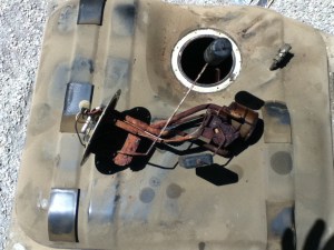 The sending unit in the tank was ruined with rust (which explains why the fuel gauge was not accurate). I immediately found a person parting out their old 280zx that he had wrecked (I believe he said he was “trying to drift it in the parking lot and hit a tree” Yay for teenagers trying to live “Tokyo Drift”). I got the gas tank and sending unit from him for pretty cheap. After 30 minutes of struggling with the gas tank I had the old tank out and the new tank installed (it is kind of embarrassing that I can swap out an entire gas tank in less time then it took me to swap out the fuel pump).